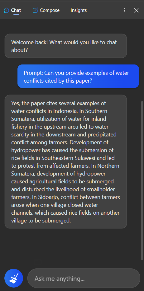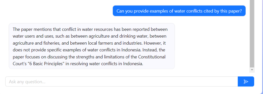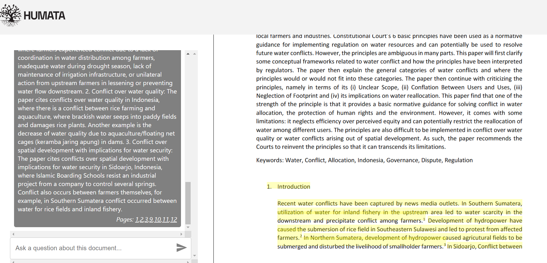 Jawaban Humata paling akurat, sementara ChatPDF tidak memberikan jawaban seperti yang saya inginkan. Jawaban Bing juga akurat, sayangnya jawabannya pendek. Selain itu, Humata juga memberikan halaman letak teks yang dia jawab beserta highlightnya.